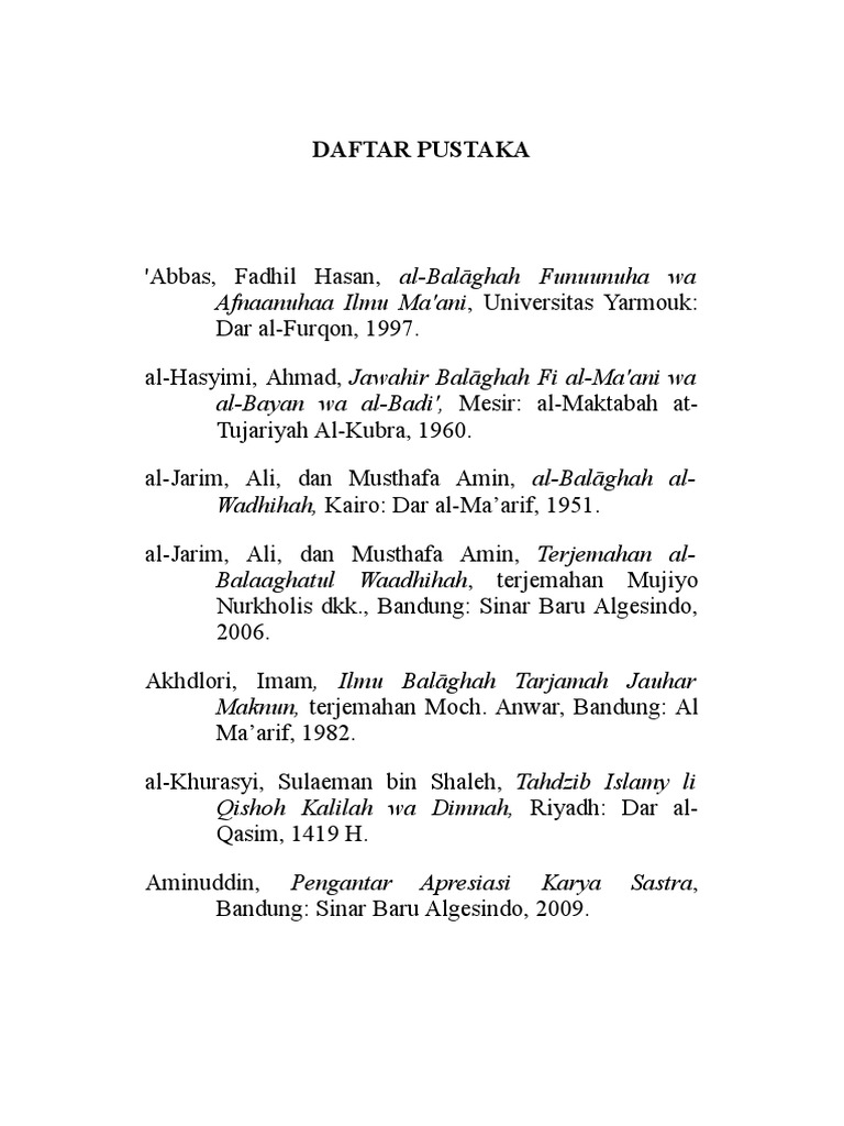 Buku Terjemahan Al-Balaaghatul Waadhihah Ilmu Menafsirkan. Refika Aditama 2007 hlm. - Al-jarimi Ali dan Musthofa Amin 2010 Terjemahan Al- Balaaghatul Waadhihah Bandung.