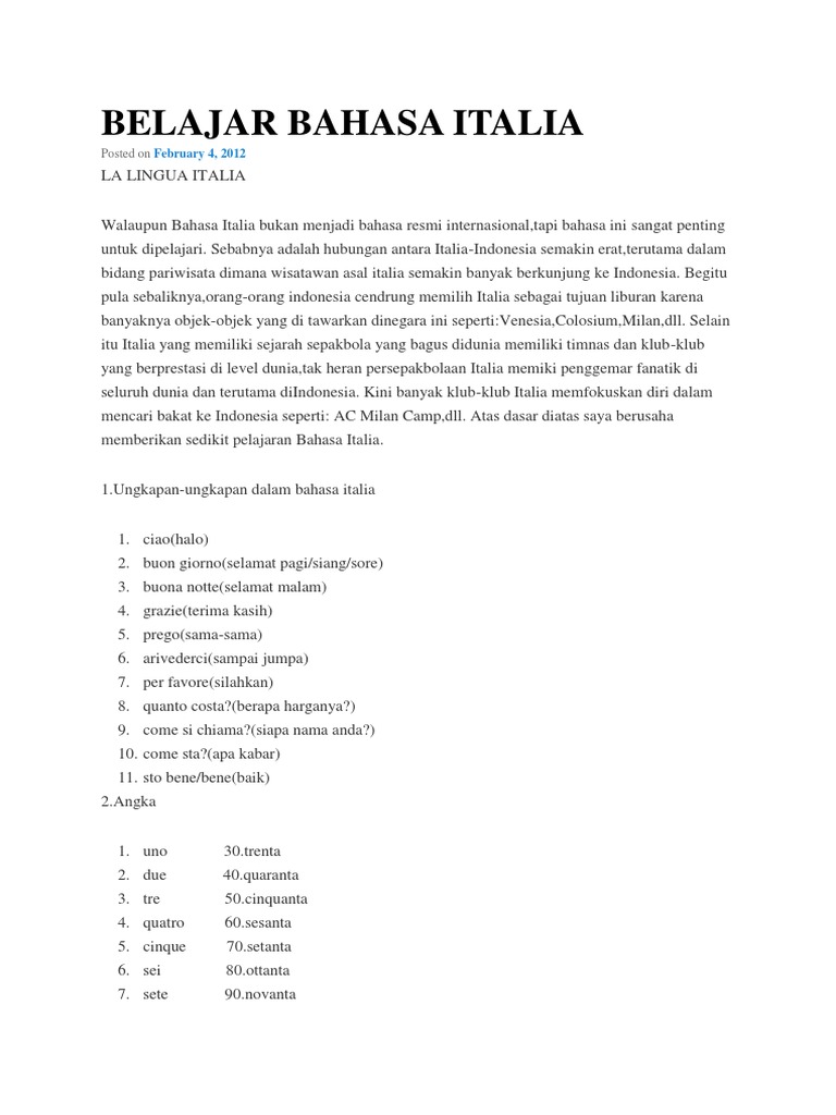 Di sini Anda dapat menemukan lebih dari 50 kata dan frasa penting yang telah diterjemahkan dari bahasa Italia ke dalam bahasa Indonesia. Hakikat Bahasa dan Pembelajaran Bahasa Mohamad Yunus SS MA. Karena begitu banyak kata dalam bahasa Inggris berasal dari bahasa Latin atau Prancis ada banyak persamaan kosakata dengan bahasa Italia.